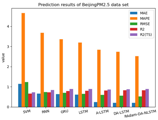 Table 2 and Figure 7 present the prediction results of , , , and for the Beijing PM2.5 test dataset, comparing RAdam-DA-NLSTM with other models. It is evident that RAdam-DA-NLSTM outperforms the other models in terms of smaller , , and , values, as well as having a higher score. These results highlight the enhanced prediction accuracy of RAdam-DA-NLSTM for the Beijing PM2.5 dataset and its advantages over other models in PM2.5 prediction. Notably, the (TS) metric reflects the prediction performance on the training set. By observing the (TS) values, we can notice that LSTM achieves better training results. However, when it comes to the test results, LSTM performs significantly worse compared to A-LSTM, DA-LSTM, and RAdam-DA-NLSTM. This discrepancy indicates that LSTM tends to overfit the PM2.5 prediction.