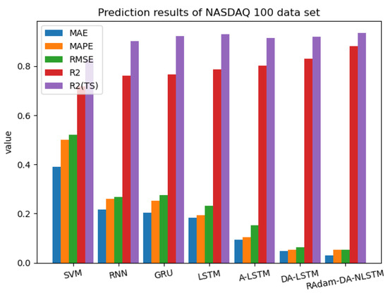 Figure 8 shows that the trend of the predicted value and real value curve of the RAdam-DA-NLSTM on the Nasdaq 100 index stock test data set is also roughly consistent, and the fitting result is quite well. In addition, it is necessary to compare the evaluation results of the above seven models in predicting the Nasdaq 100 index stock test data set. The evaluation results take the average value of 20 experiments. Table 3 and Figure 9 show the results.