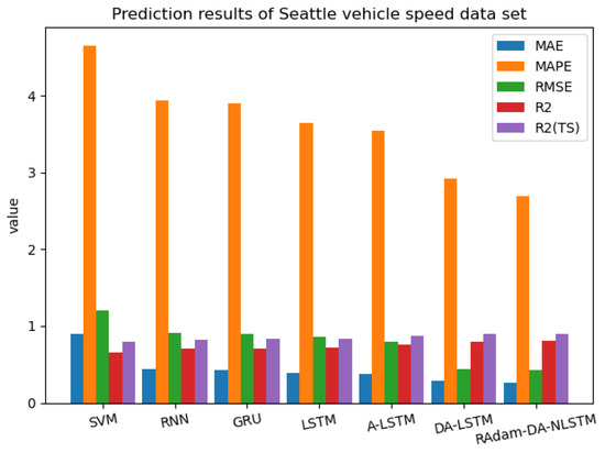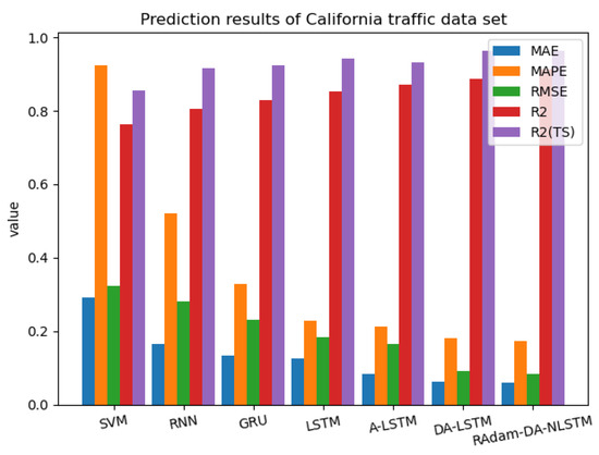 Figure 10 and Figure 11 show that the RAdam-DA-NLSTM has good fitting results for the California traffic volume data set and Seattle speed data set. Especially in the fitting of the California vehicle volume data set, it greatly highlights the advantages of the model. Then, we further compare the evaluation results of the traffic data set predicted by the above seven models. Table 4 and Table 5 and Figure 12 and Figure 13 show the results.