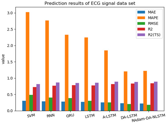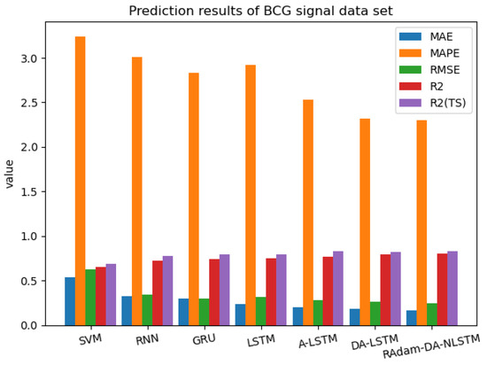 Figure 14 and Figure 15 show that the RAdam-DA-NLSTM has a strong nonlinear mapping ability for ECG signal prediction and BCG signal prediction. Then, we compare the evaluation results of the ECG signal data set predicted by the above seven models. Table 6 and Table 7 and Figure 16 and Figure 17 show the results.