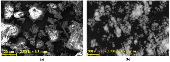 Scanning electron microscope (SEM) images of the materials used for preparing test samples: (a) composite powder zp®150; (b) PRELECT TPS303 AgNP ink.