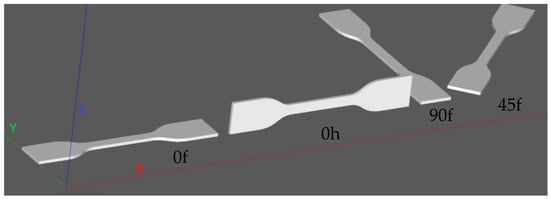 To evaluate whether the printing orientation of the substrates will affect the electrical parameters of the printed conductive paths, a test series was prepared depending on the orientation angle between the long edge of the sample and the x-axis of the printer: “0f”, “45f” and “90f” for samples aligned flat on the build plate, and “0h” for the series placed horizontally. An example of the arrangement of samples relative to the worktable in the ZPrint software is shown in Figure 3.