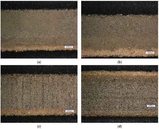 The results of the study clearly showed that substrates from the “0f” series should be selected for further testing. These samples had the best conductivity along the entire length of the sample and the best repeatability, which was not so noticeable for “45f” samples despite the measured conductivity. Additionally, “0f” substrates were less fragile and less pliable as a result of ink soaking after AgNP ink printing. Series “90f” and “0h” exhibited no conductivity at all, but they could be measured in certain parts of the paths. Visually the samples did not differ much from each other, which is visible in Figure 4. The problem with sample conductivities was identified by microscopy observation of the printed paths. Images taken by optical microscope are presented in Figure 5. In the pictures, it can be seen that the paths on “90f”(Figure 5c) and “0h”(Figure 5d) samples are heavily cracked, which influenced the continuity of the paths and thus the electrical connection could not be measured. The direction of the cracks is consistent with the substrate orientation during the printing process. As can be seen, cracks on the “90f” samples are perpendicular to the expected direction of electrical current flow through the path, causing the discontinuities. The weakly bonded interlayer space and stress in the samples due to sintering and cooling caused cracks in these areas. Moreover, the smaller dimension of the path in this direction caused more intense cracking of the silver layer compared to the path printed along the sample. The “90f” and “45f” samples were more fragile than others and could be easily damaged in the hands. Despite the fact that “0h” substrates were less prone to transverse cracking, low print resolution in the z-axis of printed layers promoted longitudinal shallow cracks on the silver paths as well (Figure 5d). Additionally, the surface of the paths was very heterogeneous due to the surface irregularities associated with the low print resolution in this direction. The surface of the deposited ink was arranged in a series of regular, parallel and narrow metallic structures that could be easily damaged during the sintering, resulting in a break in the conductive paths. In addition, these samples showed the greatest deformation resulting from the sintering process. Sample “0f” shows the most uniform surface structure of the path (Figure 5a).