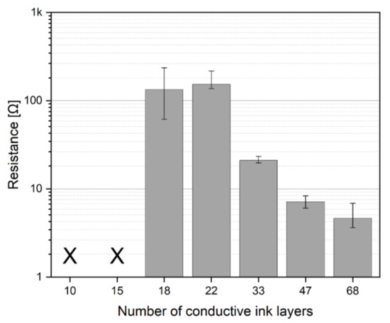 Resistance values depending on the number of printed AgNP ink layers. “x” denotes samples that exhibited no electrical conductivity.