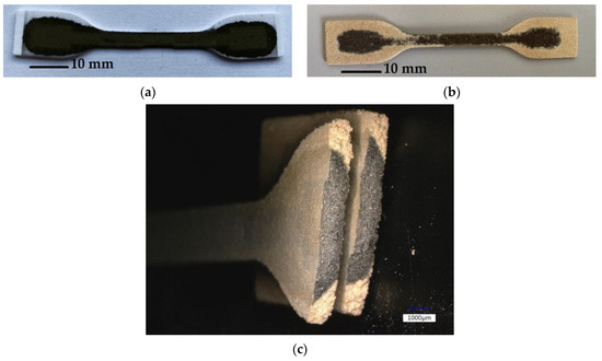 It is apparent that samples did not conduct after printing 10 and 15 ink layers. This is due to too little deposited ink, which easily soaked into the shallow layers of the porous substrate. Silver nanoparticles penetrated the pores, resulting in composite powder-ink structures, so that a small amount of them remains on the surface to create conductive path. After printing 18 layers of the AgNP ink, the resistance was first measured with average value comparable to the subsequently printed path of 22 layers. However, the deviation of results for this series of samples (18 layers) was the largest among those examined. This can be related to the very heterogeneous silver path structure for a small number of printed layers, which results in low repeatability of the obtained resistance values. For the same reason, measured resistances were not converted to resistivities, which is a common practice in the literature referring to structural electronics. The conductive path is a composite of the bonded powder and sintered nanoparticle ink, which is a heterogeneous material with an unknown exact thickness of the conductive part of the path. Generally, printed path resistance values decreased with rising number of printed AgNP ink layers to reach the minimum value for 68 printed layers. Despite achieving satisfactory resistance results, the decreasing deviation began to increase in the number of layers above 33. As can be seen in Figure 6, with the rising number of layers, ink absorption to the sides increased on the surface of the substrate. A representative example of the ink-soaked sample after 68 printhead passes is presented in Figure 8. The rising number of ink layers causes a situation in which the porous substrate is no longer able to absorb more nanosilver ink that seeps through the entire thickness of the sample (Figure 8b,c). The pictures clearly show the softening of the sample and the soaking of the ink to the sides (Figure 8a). As a result, conductive paths printed more times did not retain their dimensions consistent with those designed. However, this did not affect resistance measurement but caused increased dispersion of the results between samples with a huge number of printed ink layers.