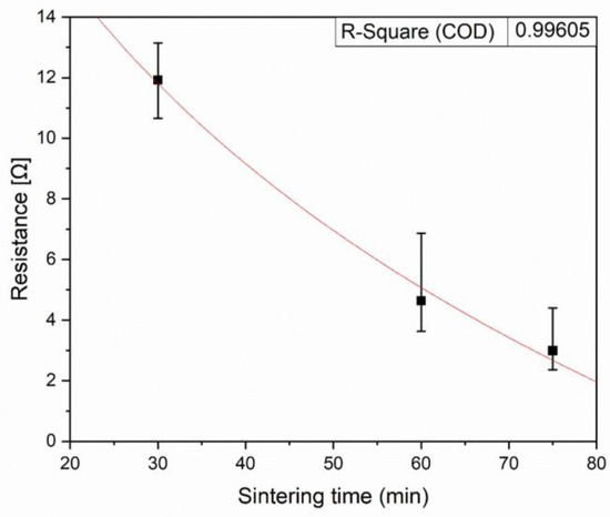 To investigate the influence of the sintering time on the path resistance, the series with the lowest resistance was chosen. Here, 60-min sintering is recommended by the manufacturer to reach the optimal conductivity of the ink, but that refers to printing on a glass substrate [33]. To check the effect of sintering time on the electrical parameters, the samples with 68 layers of AgNP ink were sintered for 3 different periods of time, and then resistance measurement was carried out. The results of this investigation are presented in Figure 9.