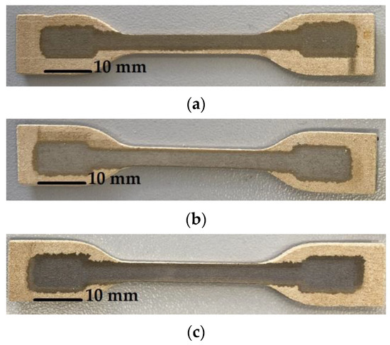 The designed sample geometry was exported to the STL file format, sliced and laid out in the workspace using dedicated ZPrint software. Taking into consideration the porosity of the parts produced by BJ and possible differences in resolution depending on the orientation of the parts relative to the printer x-axis, four possible arrangements of the parts were chosen for the test: three series of samples flat on the build plate (parallel, perpendicular and rotated at an angle of 45°) and one series-parallel and horizontally placed. For each chosen orientation, five substrates were made for simplified statistical analysis and observation of the repeatability of results. Most of the process parameters are automatically adapted to the material used, so only the layer thickness has been changed to 0.0875 mm. After the printing process is finished, the 3D printer automatically depowders the printed samples, which need to be brushed and finely depowdered using compressed air.