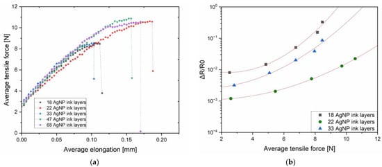 Selected samples from each prepared series, corresponding to the number of printed layers of AgNP ink, were subjected to static tensile tests. Additionally, this was combined with the simultaneous measurement of the resistance of representative samples to investigate the potential applications of the prepared conductive structures as resistive strain sensors. To achieve this, dog-bone-shaped samples were placed in the testing machine grips with additional dielectric separators. Probes from a multimeter were attached to the contact fields of the conductive paths to enable resistance measurement at regular time intervals throughout the entire duration of the test until sample failure. Not all prepared samples were suitable for testing due to their fragility, which made them very easily broken when locked in the grips. The stress-strain curve for all samples and the relative resistance changes as a function of applied force for representative samples are presented in Figure 13.