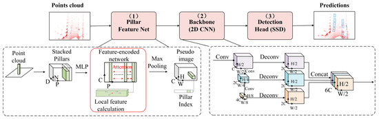 This algorithm takes the original point cloud data information as input, and first expresses the point cloud as a uniformly distributed pillar: the three-dimensional point cloud information is directly obtained from the top view, all points are discretized into a uniform square network on the x–y plane in the grid, and each pillar is cubic with infinite extension in the z-axis direction of each grid.