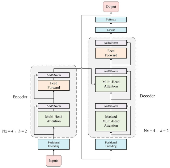 The feature encoding network structure of this algorithm is shown in Figure 2 below, which is a network structure based on the encoder–decoder. The input of the feature encoding network is the point cloud information represented by the pillar distribution, and a vector sequence is generated through position encoding, and input to the multi-head attention module for calculation; each element of the input sequence is compared with other elements in the sequence Elements interact and give different weights according to their relevance. This interaction is realized by calculating the attention weight matrix; then it is input into the feedforward neural network module, and the output of the attention layer is further nonlinearly transformed; additionally, in order to prevent degradation problems during the training process, we add ResNet residual neural network [25] and LN layer [26] (Figure 2: Add&Norm module); the difference between the decoder and the encoder is that there is add a masked multi-head attention module, whose input is the predicted output of the entire feature calculation process; and the final output layer converts the output of the decoder into the final probability distribution through a linear transformation and Softmax function for generating prediction results. Nx represents the number of encoders and decoders, that is, the number of layers of the Transformer. Each layer independently processes the input and passes its output to the next layer.