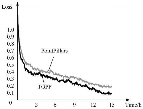 The optimizer selected during training is Adam_onecycle, and the maximum learning rate LR is 0.002. This algorithm and PointPillars are trained under the same conditions. During the training process, the loss change curve before and after the model improvement is shown in Figure 3. It can be seen from the figure that the TGPP has a stronger feature learning ability.