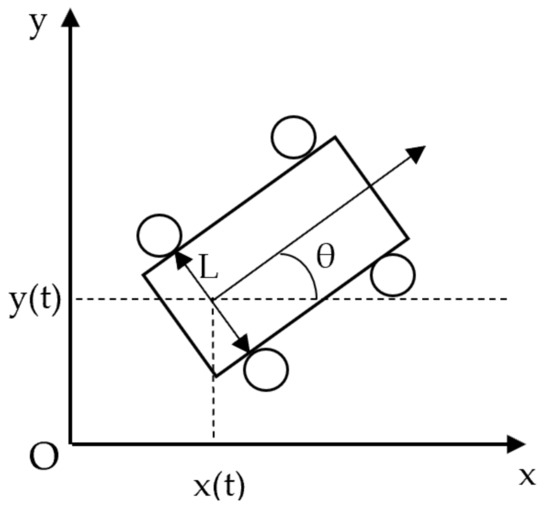 The kinetic equation is the description of the relationship between the Oxy coordinate in the Cartesian coordinate system of the wheelchair and the velocity of two wheels, as described in Figure 2.