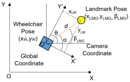 From Figure 3, the landmark coordinate in the 2D environment is calculated for the wheelchair coordinate as follows: