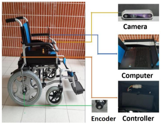 Wheelchair with the RGB-D camera, encoder, and PC.