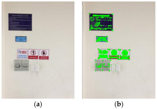 An input image with a white wall and different objects, including information and instruction boards and switch panels, is shown in Figure 5a. In Figure 5b, the small green circles on the objects are features extracted from the input objects using the ORB detector. In addition, these features have the most distinct colors or outstanding objects compared to others. Therefore, these main features are used to detect landmarks and applied for localization and planning for mobile wheelchairs.