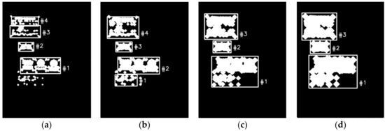 For processing dilation of images, the 3 × 3 kernel K with the common structuring element was applied if a kernel with the structure of more or fewer elements often affects dilation results. Figure 6 shows the connection of the main features of the objects, as shown in Figure 5, where the dilation of the main features is performed in different iterations. With different repetitions, the main features of the object will be dilated and then show connectivity problems, such as main features at discrete or overlapping positions. In particular, with one repeat, Figure 6a shows the discrete main features of the object, while with the number of the different increasing repetitions, the overlap of the main features will appear, as shown in Figure 6b–d. As a result of the repetition of feature point dilations, the number of features found based on the lengths of the contours also changes. In particular, Figure 6a,b show that four bounding boxes are detected and assigned symbols (from #1 to #4), while only three bounding boxes are detected for a feature frame as shown in Figure 6c,d (from #1 to #3). It can be seen that when the number of iterations is one, the objects are incorrectly defined and incomplete. In particular, the algorithm could not detect the switch panels, while the dark blue bulletin board could recognize two objects. In the case of a large number of iterations (10 or 15 iterations), the number of detected objects is still wrong, in which the switch panels and the indicator panels are overlapped to be an object. Therefore, with five iterations, the objects in the image are exactly detected, as shown in Figure 6. It means that the five iterations are most suitable for detecting objects, and it is a basis for selecting a typical landmark based on feature density.