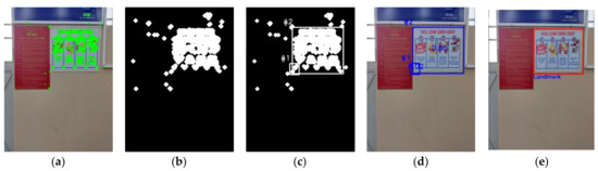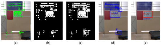 Representation of the process for the landmark recognition in the natural lab environment at the distance of 2 m from the camera to objects: (a) image with key points; (b) dilated image; (c) feature frames image; (d) objects image; (e) landmark image.