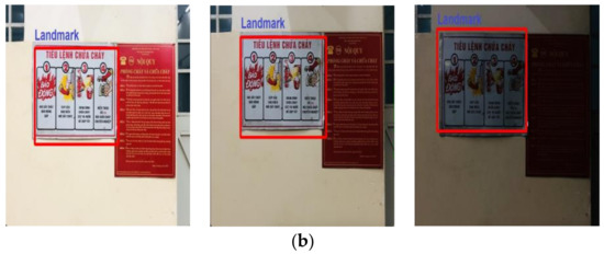 Table 3 describes the experiment for detecting landmarks with different lighting conditions and at different distances. From this table, it can be seen that, at the distance of 1 m and 2 m, the IoU value is greater than 0.8. This means that the recognition results are good, and the features extracted using the ORB detector have good invariance to changes in illuminance. In addition, when the distance from the landmark to the camera is more than 2 m, the IoU values are less than 0.8 and are reduced with light intensity. Figure 10 depicts two natural landmarks detected in the experimental environment described in Table 3.