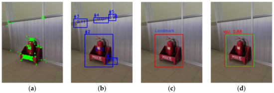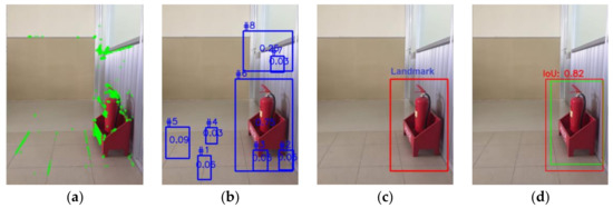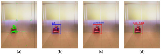 Experiments with different angles between the camera position and objects, such as the right wall of the laboratory, were performed as shown in Figure 11, Figure 12 and Figure 13. In particular, these object images were taken at the angles of 0°, 35°, and 45°, respectively. The results show that the proposed algorithm correctly recognizes the same object with different shooting angles, which will be selected as a landmark. In addition, Figure 11d, Figure 12d, and Figure 13d show that the bounding box in which the proposed algorithm predicts the landmark (red rectangle) overlaps most of the ground-truth bounding box, called the actual landmark (green rectangle). The IoU value in all three cases is greater than 0.8, indicating that the accuracy is very high.