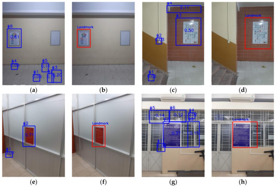 Natural landmarks detected from different areas: (a) image frames on the wall in the corridor; (b) recognized landmark on the wall in the corridor; (c) image frames on another wall in the corridor; (d) recognized landmark on another wall in the corridor; (e) image frames on the wall of the lab room; (f) recognized landmark on the wall of the lab room; (g) image frames on another wall of the lab room; (h) recognized landmark on another wall of the lab room.