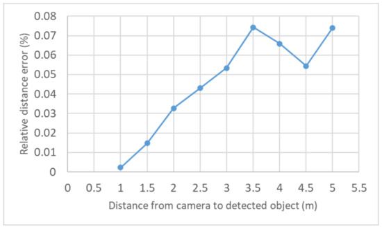 In this article, we performed distance measurements from the camera’s center to landmarks using the RealSense D435 camera and then compared them with the true distances of those landmarks in the lab environment. Figure 15 represents the relative error between the average measuring distance and the distances of the actual landmarks, in which each position is measured 100 times. It is obvious that the relative distance error has a change of 0.01% to 0.07%. When the detection algorithm makes a landmark prediction with a low IoU value, the average depth value may be out of the object. Therefore, this is true for small objects, and they are noted at the peaks of 3.5 m and 5.0 m, as shown in Figure 15.