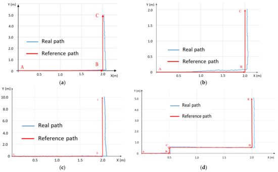 The next experiment is that the position error of the wheelchair in the 2D space is checked using the encoder data. In this experiment, the wheelchair was moved along a reference line (red line), and then the position data of the wheelchair were recorded (blue line), as shown in Figure 16. As shown in Figure 16a, the wheelchair moved to the position x = 2 m, y = 5 m in the 2D space following a pre-established line. Assuming that the initial coordinates of the wheelchair are x = 0, y = 0, as shown in Figure 16b, the wheelchair moved to the position x = 2 m, y = 2 m. In Figure 16c, the wheelchair moved to the position x = 2 m, y = 10 m. Therefore, the trajectory of the wheelchair moving to the position x = 2 m, y = 5 m with the perpendicular corner points is described in Figure 16d.