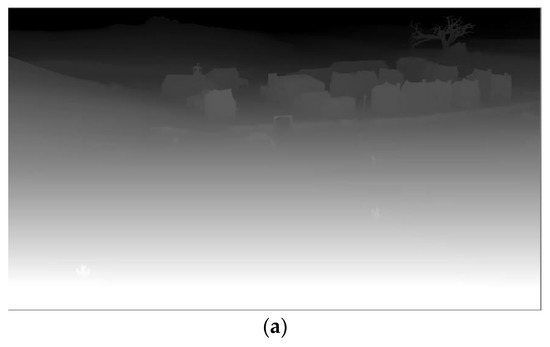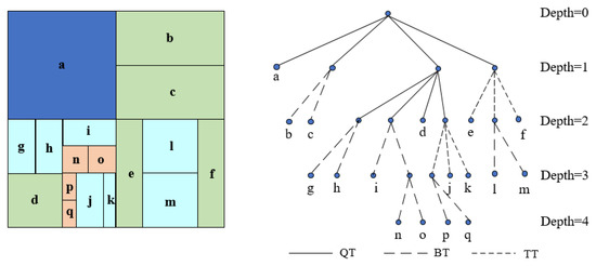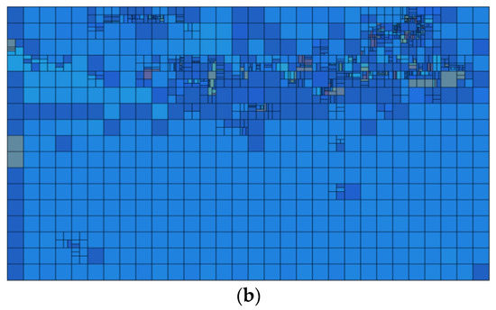 The relationship between CU block size and its content is widely recognized, and it is observed that depth maps often contain numerous flat regions comprising pixels with similar or even identical values. As a result, the utilization of larger blocks in the depth map is significantly more probable than the adoption of smaller blocks. Figure 2 shows the depth map and CU division of the “GhostTownFly” video frame. We can see that the depth map has a large number of areas at the bottom and a small number of areas at the top as smooth areas, corresponding to a CU size of 64 × 64 at the corresponding position in Figure 2b, and the division method is not used. Only the middle of the figure is in the edge position, and the CU in the edge region in the corresponding Figure 2b continues to be divided; the details are gradually highlighted. Therefore, using an exhaustive partition size search method will generate a lot of coding time to check unnecessarily smaller CUs, which leads to a large computational load. Therefore, it is necessary to terminate CU partitioning early.