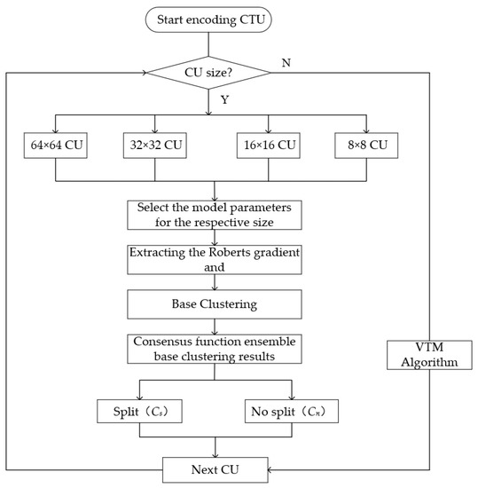 For coded frames, we divide them into their corresponding datasets according to 64 × 64, 32 × 32, 16 × 16, and 8 × 8, for example, D64×64 = {n1, n2,…, nm}, which can be divided into two clusters by the above similarity metric process. One of the clusters denotes no division of CU, which is denoted as Cn. The other cluster denotes division of CU, which is denoted as Cs. Similarly, the other N × N CU is similar to the clustering process. Typically, as the sample data approach the cluster center, the likelihood of being assigned to a particular cluster increases. Figure 3 illustrates the flowchart of the algorithm.