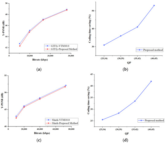Experimental results of video sequences under different quantization parameters (QPs): (a) RD curve of “GTFly”, (b) time-saving rate curve of “GTFly”, (c) RD curve of “Shark”, (d) time-saving rate curve of “Shark”.