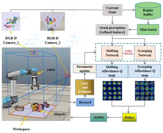 Figure 1 depicts the proposed system’s general layout, where two RGB-D cameras extract images and combine image data to create visual perception in simulation. Two fully convolutional action neural networks choose the best action based on these features.