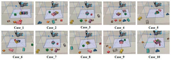 Figure 5). Each case involves unknown objects in irregularly placed scenes, with other objects blocking the robotic tasks. The environmental state changes after performing the shifting action, providing sufficient space for the grasping action. Finally, the robot successfully grasps the object. We execute 10 runs per test, and the threshold of the action numbers is set to 2 × m per episode (m is the number of objects that must be picked per case) per episode. The performance is evaluated based on the average grasp efficiency, defined as