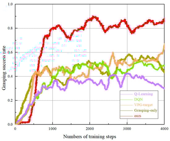21], our proposed approach presents better completion and success rates. Additionally, even though the DQN algorithm creates endless samples in real time based on the experience replay pool for supervised training, it uses a random policy to select actions and disregards the synergy of shifting and grasping, decreasing the grasping success rate [