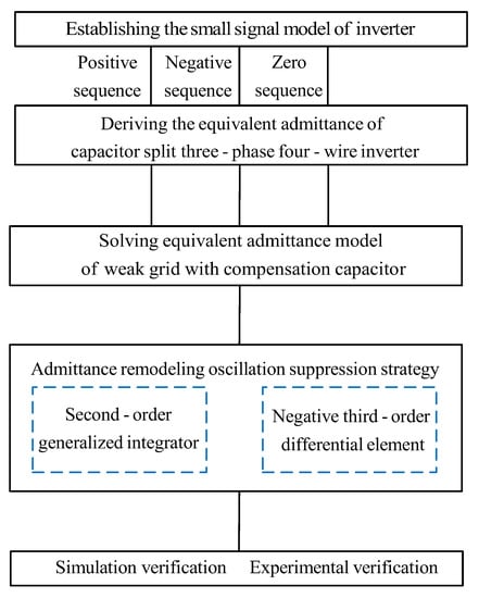 Therefore, this paper takes the three-phase, four-wire split capacitor inverter (TFSCI) system as the research object, establishes the small signal correlation model of the inverter considering the disturbance of grid voltage, inverter current, and duty cycle variables, and deduces its positive, negative, and zero sequence admittance model, which solves the small disturbance impedance modeling problem considering the dynamic characteristics of the phase-locked loop. Subsequently, the risk of positive, negative, and zero-sequence instability of the inverter connected to the grid with a shunt capacitor is analyzed. An admittance-reshaping oscillation suppression strategy based on a second-order generalized integrator (SOGI) and a negative third-order differential element is proposed to improve the stability of positive, negative, and zero-sequence systems of TFSCI. The influence of the main control parameters on the stability of the system is analyzed. Simulation and experiment verify the effectiveness of the three-phase, four-wire inverter oscillation suppression strategy under a weak grid. The flowchart of the research methodology is shown in Figure 1.
