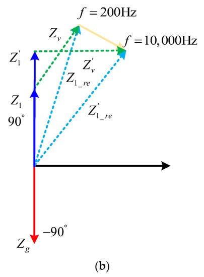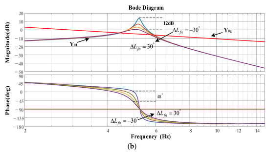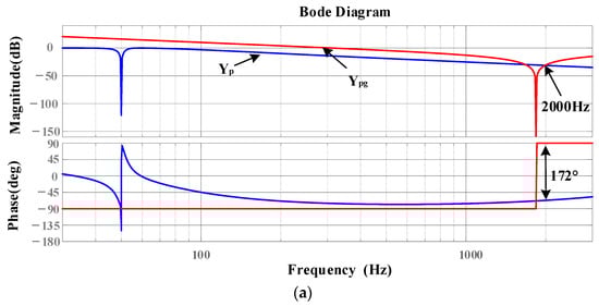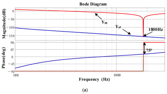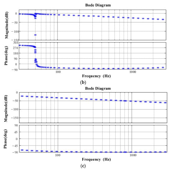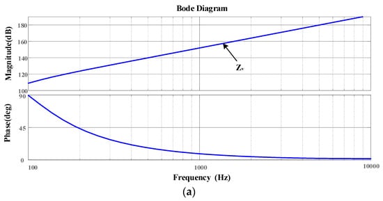 Figure 10a is the Bode diagram of . It is observed that in the frequency range of 100 Hz~10,000 Hz, the amplitude of increases linearly with the frequency and the phase tends to 0, that is, gradually shows resistance characteristics with the increase of frequency. Figure 10b shows the impedance vector diagram of the inverter after remodeling. It can be seen that when the frequency increases, the impedance phase of the inverter system gradually decreases and the amplitude increases from to . It can be seen that the introduction of a high-frequency oscillation controller improves the system’s harmonic suppression ability and phase margin, and the proposed control strategy can effectively reduce the high-frequency instability risk of TFSCI.