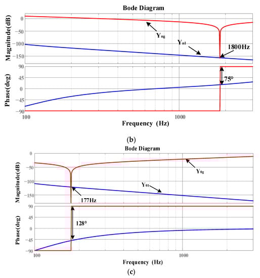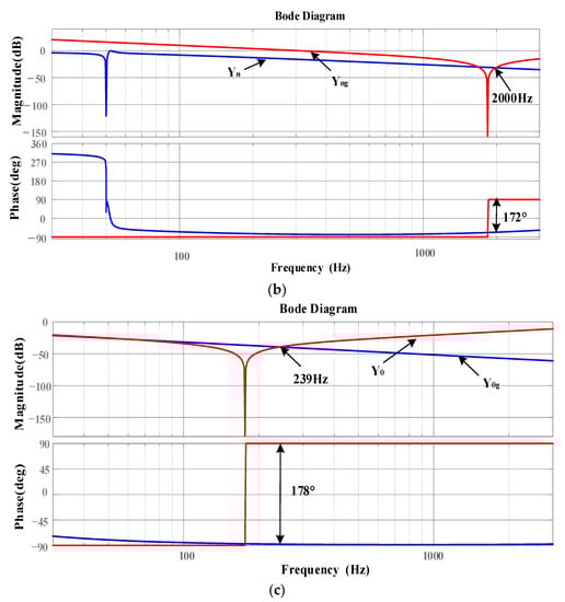 In order to verify the correctness of the established admittance model and clarify the stability of the TFSCI when it is connected to the grid with a shunt capacitor under a weak grid, Figure 4 and Figure 5 show the frequency sweep diagram of the admittance model of the TFSCI and the admittance Bode diagram of the TFSCI and the grid with a shunt capacitor. In order to simulate the weak grid environment, the equivalent inductance Lg of the grid under the weak grid is set to 2 mH. Comparing Figure 4 and Figure 5, it can be seen that the frequency sweep results of the TFSCI are consistent with the admittance curve of its admittance model, which verifies the correctness of the model built in this paper. Further observation of Figure 5 shows that the intersection of the positive, negative, and zero sequence admittance of the inverter and the grid admittance amplitude is at 2000 Hz, 2000 Hz, and 239 Hz, respectively. Based on admittance stability theory and practical engineering experience, the positive, negative and zero sequence stability margins of the inverter system are , and . In summary, there is a risk of oscillation instability when the TFSCI is connected to the grid with shunt capacitors.