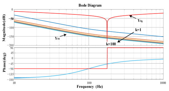 Bode diagram of zero sequence admittance and grid admittance of TFSCI when k changes from 1 to 100.