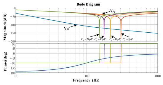 Bode diagram of inverter zero-sequence remodeling admittance when parallel compensation capacitors change.