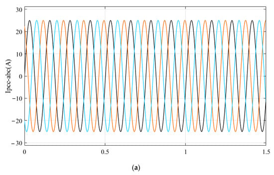 Figure 15a shows the output current waveform of the inverter without a shunt capacitor under a weak grid. It can be seen that the inverter can operate stably. Figure 15b shows the output current waveform of the inverter after adding the shunt capacitor to the grid. At this time, the inverter system is unstable, which verifies that the addition of the shunt capacitor to the three-phase, four-wire inverter under the weak grid will cause the system to oscillate.