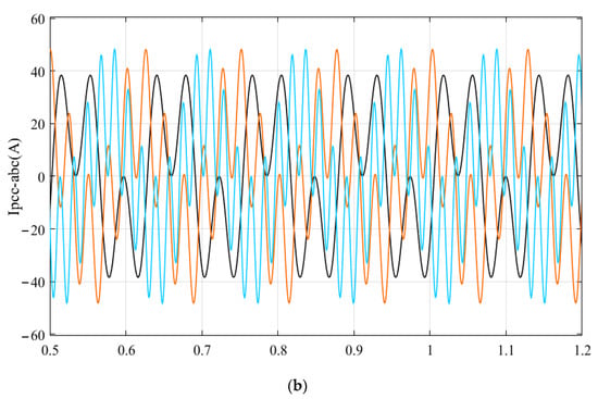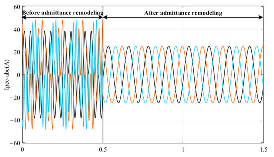 Figure 17 shows the output grid-connected current waveform of the TFSCI after the parallel capacitor is added and the 5th and 7th harmonic voltages of 0.1 pu are injected into the grid voltage. At 0.5 s, after adopting the proposed admittance remodeling strategy, it is observed that the output current power quality of the system is better at this time, and the system can operate stably. The simulation results show that the proposed oscillation suppression strategy still has strong adaptability under harmonic grid.