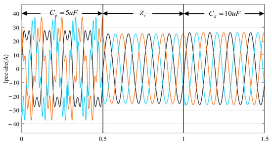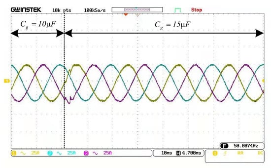 Figure 21 is the experimental waveform of the grid-connected current of the inverter when the capacitance changes after the impedance remodeling strategy is adopted. From the diagram, it can be seen that the system can still maintain stable operation when the grid-side shunt capacitor changes from 10 μF to 15 μF, and the inverter system can complete the transition within 0.005 s after capacitor switching, which verifies that the impedance remodeling strategy designed in this paper has strong adaptability to the change of shunt capacitor.