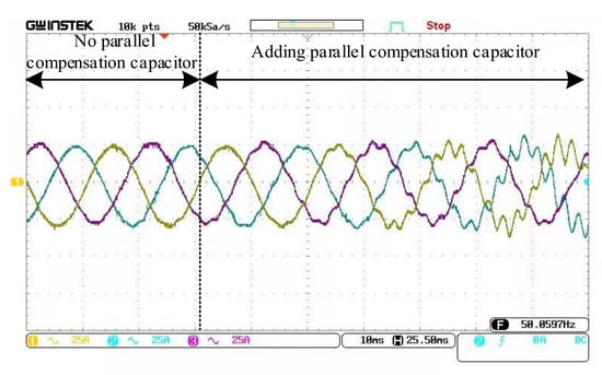 Experimental waveform of inverter grid-connected current before and after adding parallel compensation capacitors.