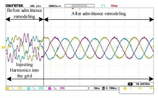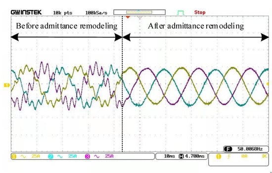 Experimental waveform of inverter grid-connected current before and after admittance remodeling when harmonics are injected into the grid.
