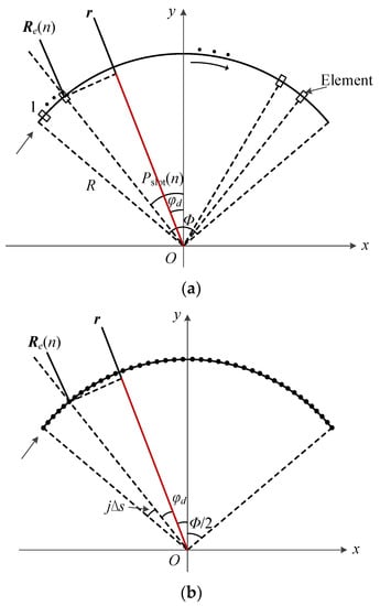 When searching for the in-phase elements, the arc is discretized by a step angle Δs, as depicted in Figure 1b. Therefore, the Equations (1)–(5) are rewritten as: