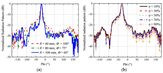 Radiation patterns when setting the same beam direction, (a) with different R, (b) with different η.