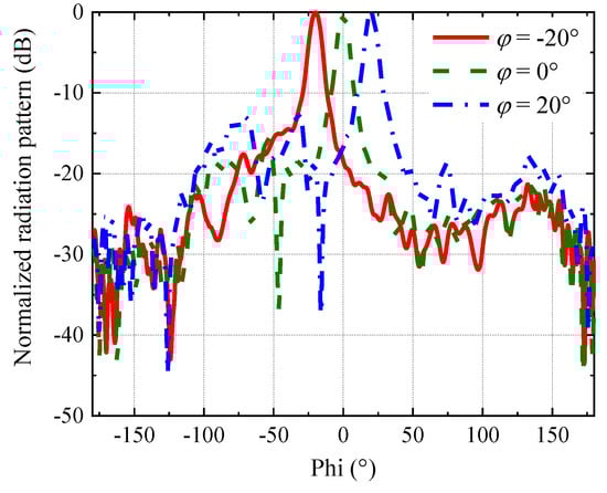 Figure 3a illustrates the radiation patterns of arced structures with different curvature radii based on the radiation field calculation model of the proposed arced array when setting the same beam direction, φd. It can be found that the expected directional beam is achieved by using the established theoretical model. Furthermore, it is possible to generate the same beam-direction pattern for arced SIW LWAs with different curvature radii by changing the position of the elements. Consequently, for cylindrical objects with different radii, the unit position distribution of the directional arced LWA can be easily generated through the model to meet the requirement. Equation (14) gives the relationship between radiation efficiency and S parameters. Assuming |S11| is 0, which means that there is no reflection in the input port, for a given radiation efficiency the corresponding |S21| can be obtained, and the corresponding attenuation constant α can be further calculated according to Equation (11), i.e., the attenuation constant can be changed by setting different radiation efficiencies. Figure 3b depicts the radiation pattern calculated with different radiation efficiencies or different attenuation constants, in which it is shown that as the radiation efficiency increases, the calculated main beam of the directional pattern becomes narrower and the directionality becomes more prominent. Figure 4 provides the radiation patterns of different beam directions generated by the same arc structure, which indicates that by setting different beam directions in the model, the corresponding unit position distribution can be calculated. In other words, for an arced SIW LWA with the same array curvature radius and transmission line structure, different directional beams can be obtained by changing only the position of the slots.