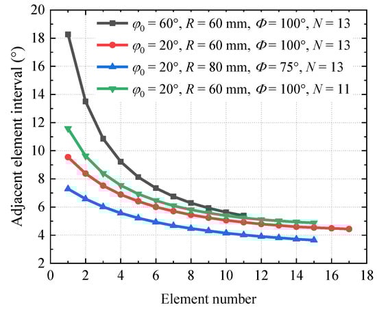 Calculated variation trend of intervals of adjacent elements with different φ0, R, Φ, and N.
