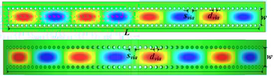 The operating frequency was set to 28 GHz. Table 2 and Figure 9 respectively provide the cutoff frequencies and instantaneous electric field distribution of the two kinds of SIW with the same structural parameters, among which the theoretical cutoff frequencies in Table 1 was calculated by Equation (17) in [26]. It can be seen that the propagation properties of the arced SIW and the straight SIW are basically the same. Therefore, the arced SIW can be designed in line with the design method of the straight SIW [26].