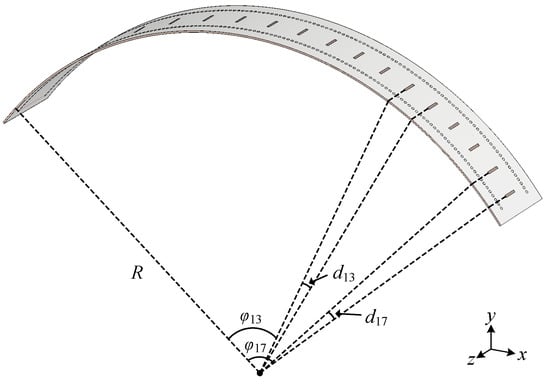 Secondly, we applied the proposed model to calculate the radiation element positions corresponding to the beam with specific direction to determine the slot positions of the arced LWA. When φd = 20°, N = 13, R = 60 mm, Φ = 100°, and f0 = 28 GHz, the element positions calculated from the theoretical model are shown in Table 2 and the structural diagram of the arced SIW LWA were established accordingly, as shown in Figure 10. The element position φm in Table 3 represents the angle between the mth element and the first input port, and dm in Figure 10 represents the angle between the mth and the (m − 1)th element, for which d1 is the angle between the first element and the input port. Taking the flexibility of the structure into consideration, the substrate material adopts Rogers RT5880: εr = 2.2, tanδ = 0.0009, the thickness of the dielectric h = 0.254 mm, and the two rows of metallic vias and the waveguide width comply with Equation 16. When R, Φ, and N are determined, the dielectric constant of the equivalent waveguide can be obtained by Equation (18), and accordingly the equivalent width weff can be calculated by Equation (19). Then, the width of the SIW can be determined by Equation (15) [26].