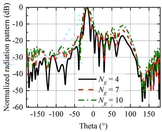 Normalized radiation patterns of the proposed arced LWA with different values of Ng.