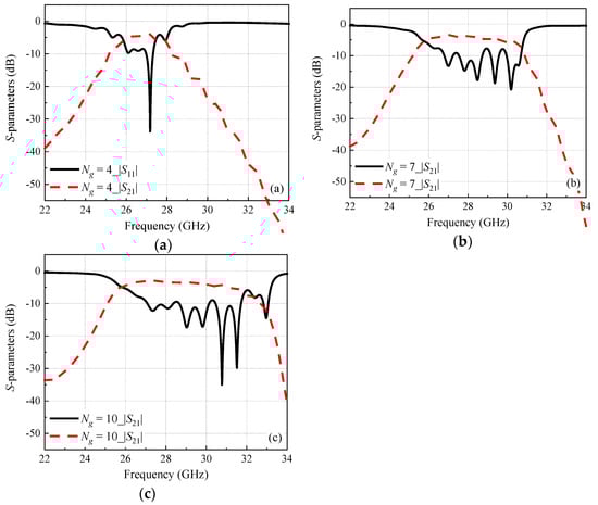Simulated S parameters of the proposed arced LWA with different values of Ng, (a) Ng = 4, (b) Ng = 7, (c) Ng = 10.